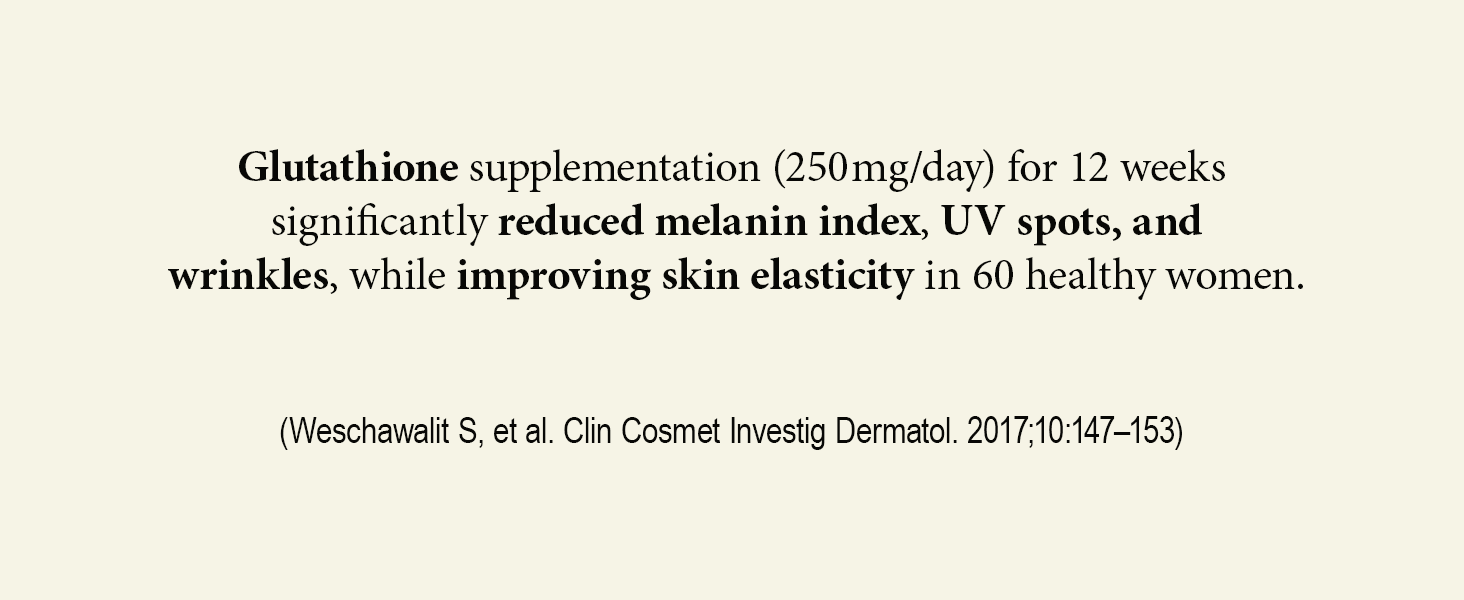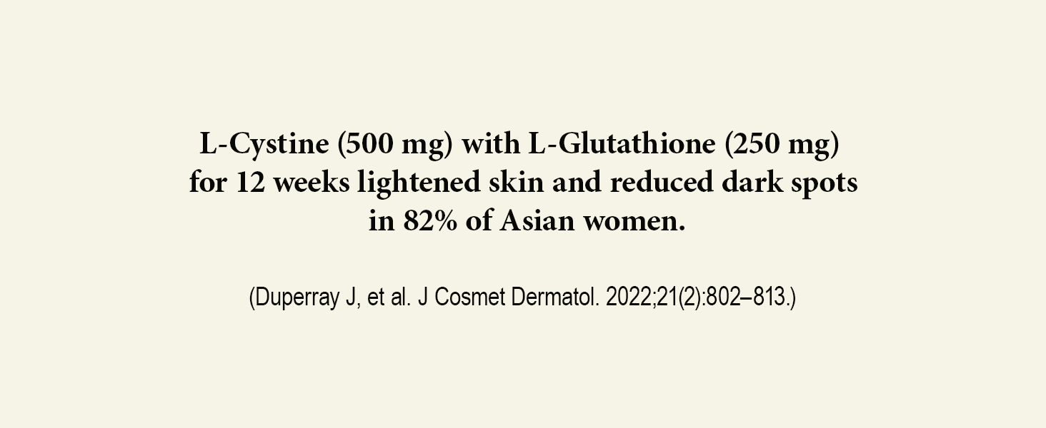L-Cysteine and Glutathione reduce melanin, fading dark spots and promoting an even skin tone.