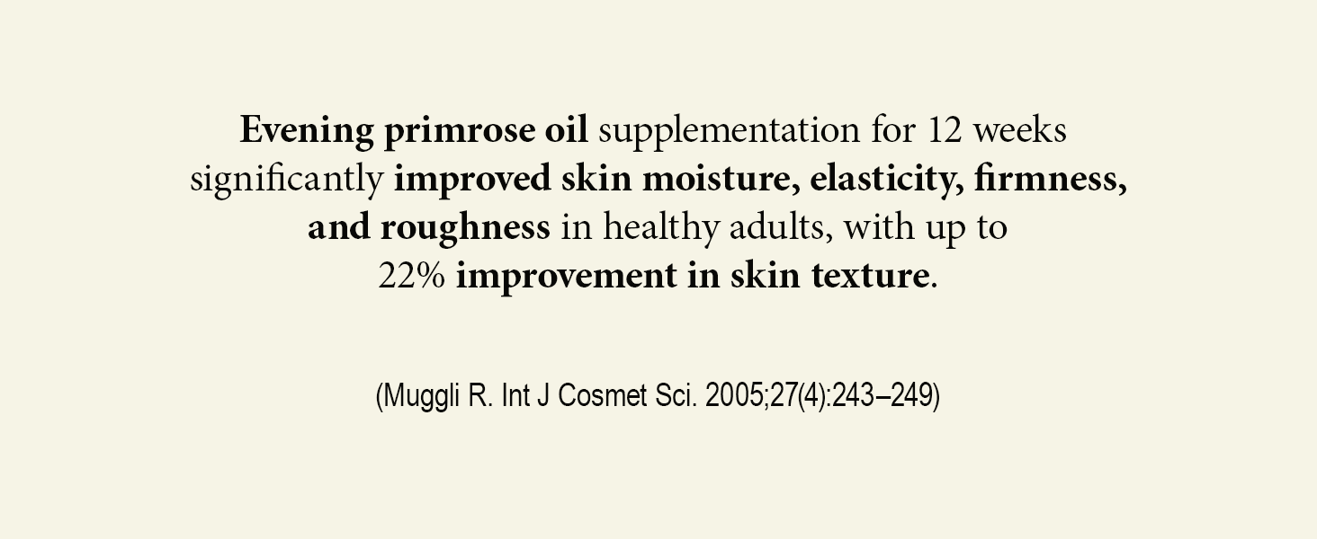Primrose Oil hydrates and improves elasticity, while antioxidants repair cells for a brighter, youthful look.